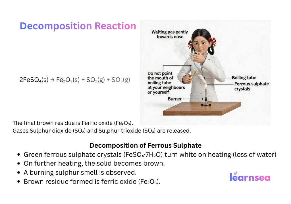 2FeSO₄(s) →[Heat] Fe₂O₃(s) + SO₂(g) + SO₃(g)